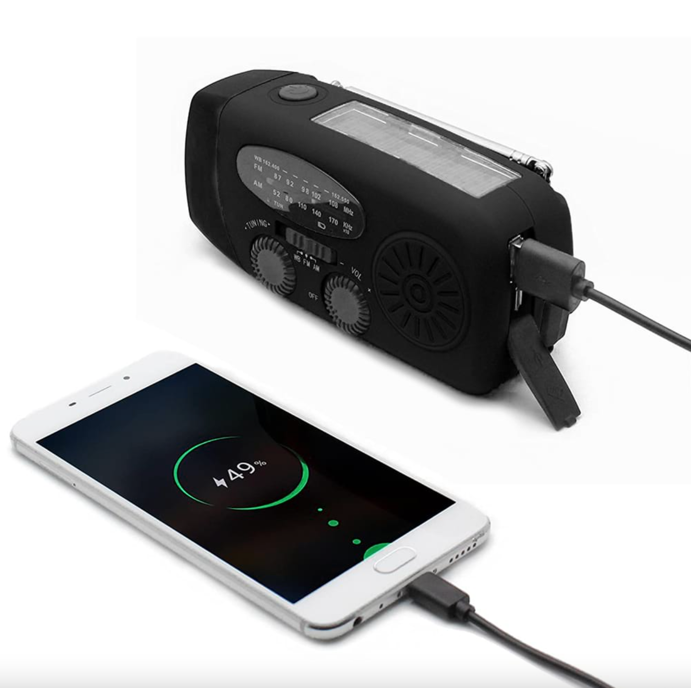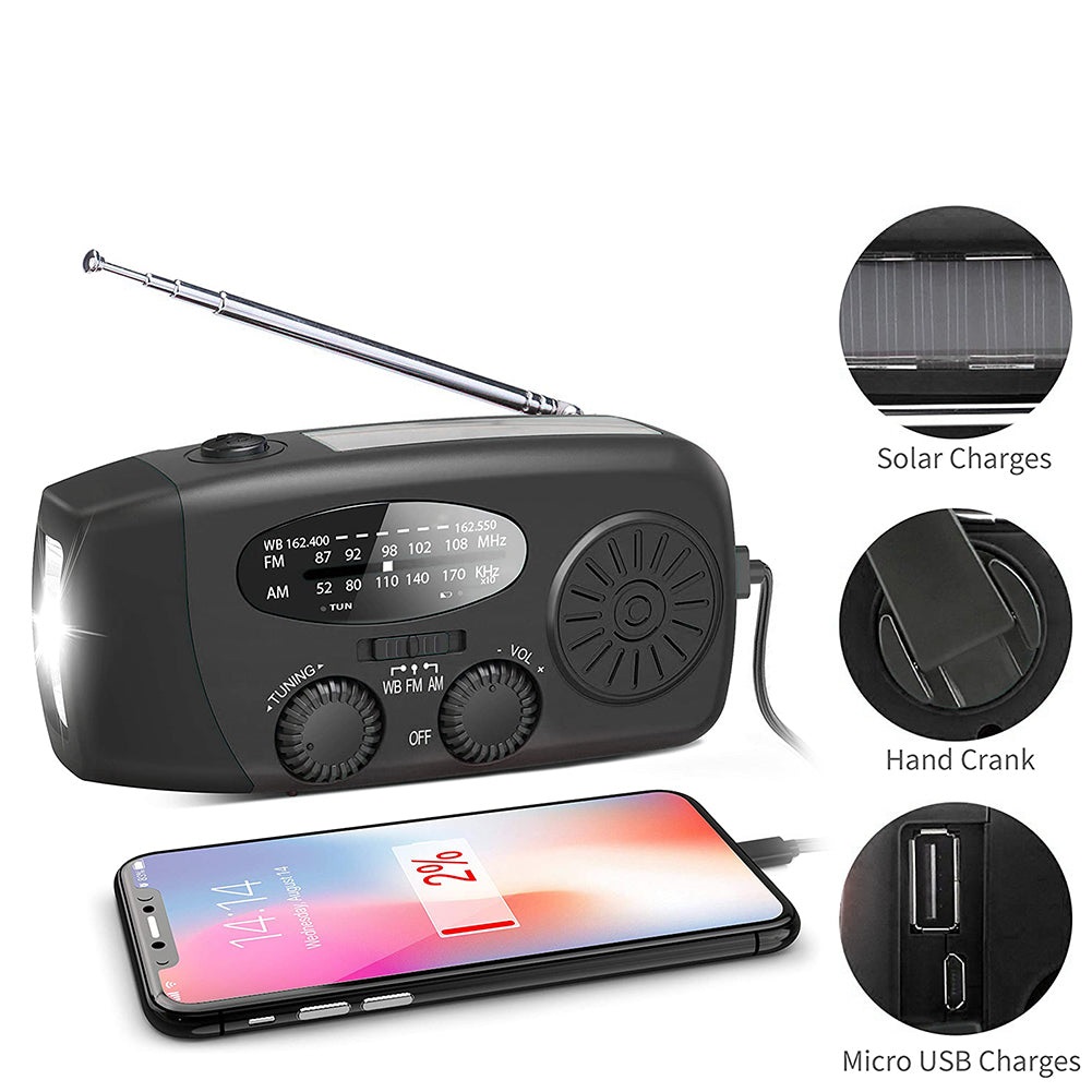 The battery can be operated with the hand crank or solar panel or via USB. You can use it as a power bank to charge your phone or other USB-charged devices. The LED flashlight is powerful and bright.